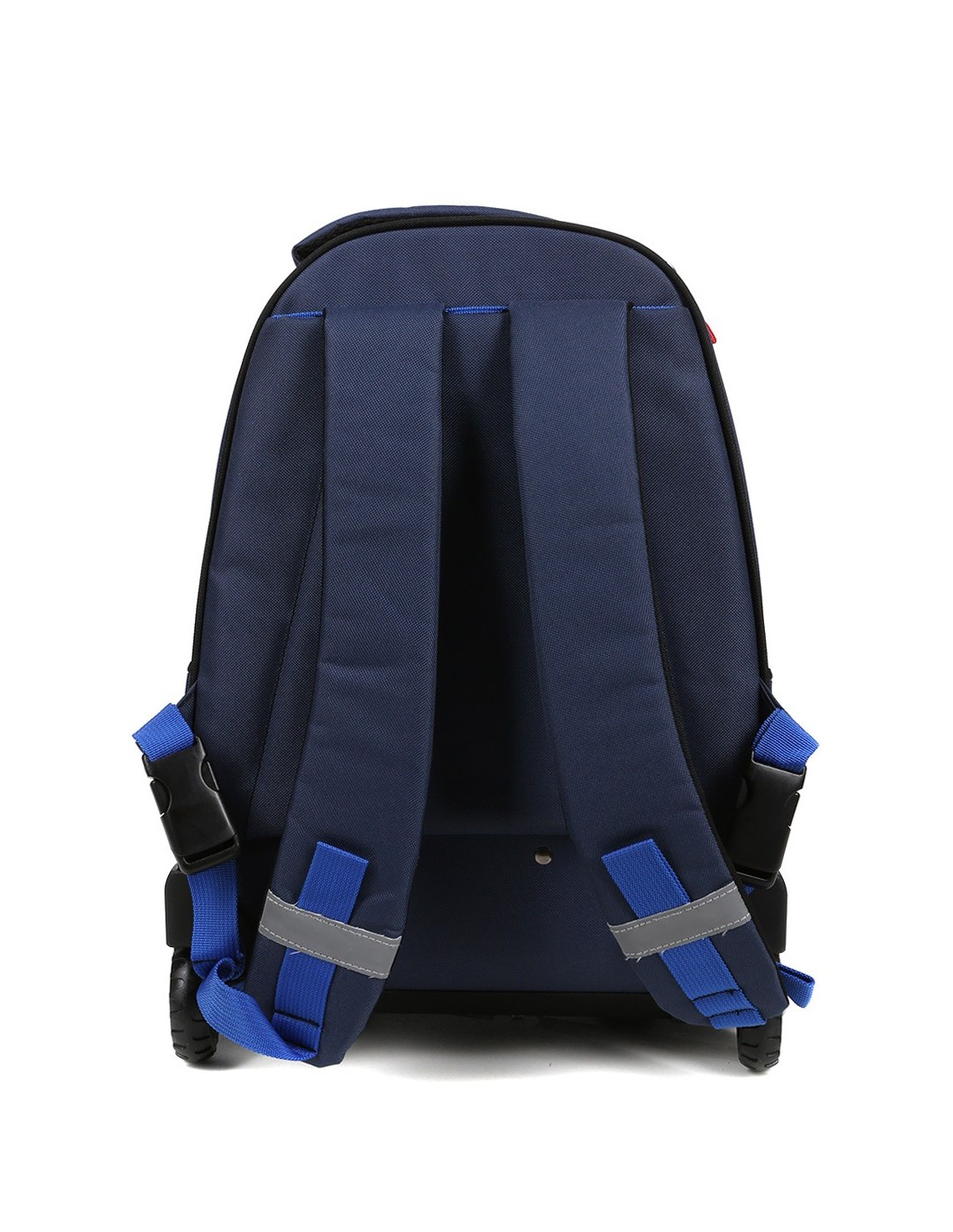 Le sac à dos trolley Fédération Française de Football 2 Étoiles se déplace soit en étant tracté soit en étant porté. Une poche zippée située à son sommet cache un trolley qui se règle sur plusieurs positions pour s'adapter à la taille du garçon. Deux roues encastrées permettent de rouler simplement le sac derrière soi, après avoir pris soin de détacher le bas des bretelles escamotables et de les avoir glissées derrière le panneau prévu à cet effet, afin qu'elles ne se prennent pas dans les roues. Les pieds protègent le revêtement des éraflures et de la saleté lors du roulement. Les bretelles et le dossier matelassés permettent de porter le sac sur les épaules de façon confortable. Moussée et recouverte de tissu respirant, la poignée prévue pour porter le sac à la main est elle aussi ergonomique. Côté sécurité, la visibilité de l'enfant est renforcée par des patchs réfléchissants.