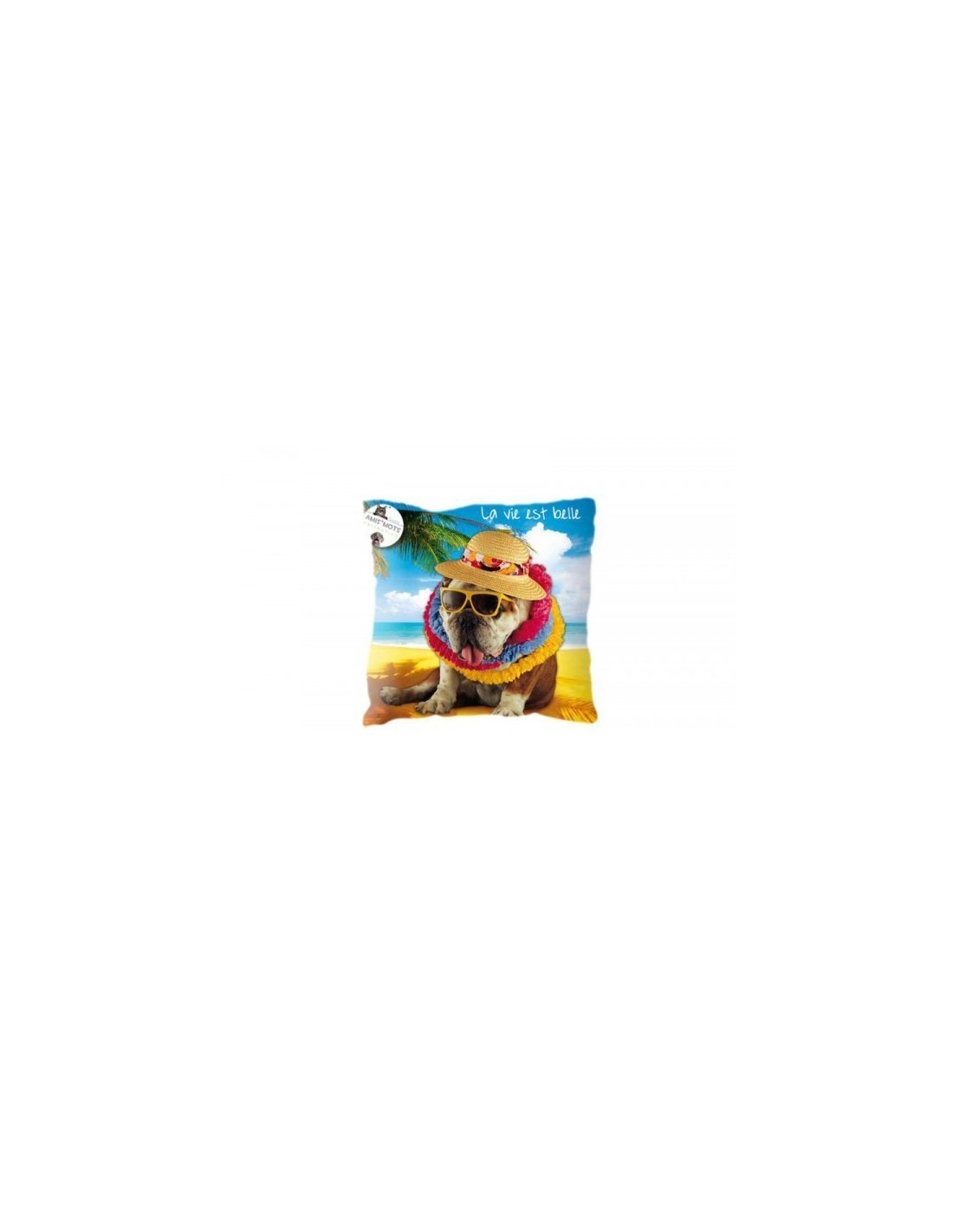 Coussin d'un chien en vacances avec ses colliers,chapeau de paille et lunette. La vie est belle dos du coussin en tissu feutrine bleue dimensions: 34 X 34 cm en polyester