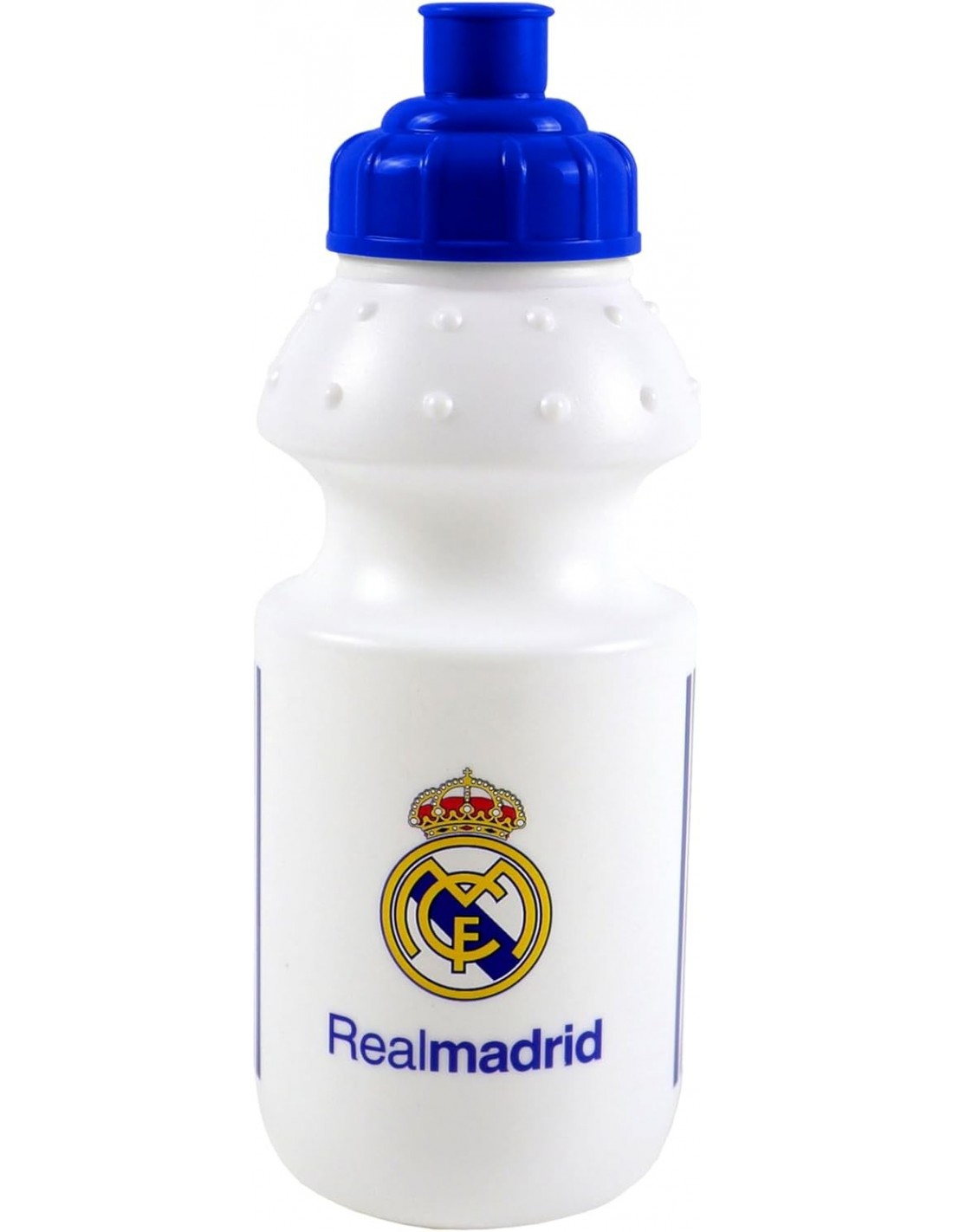 Bouteille en aluminium avec l'écusson monochrome du Real Madrid, idéale pour afficher l'écusson de votre équipe avec un design élégant.