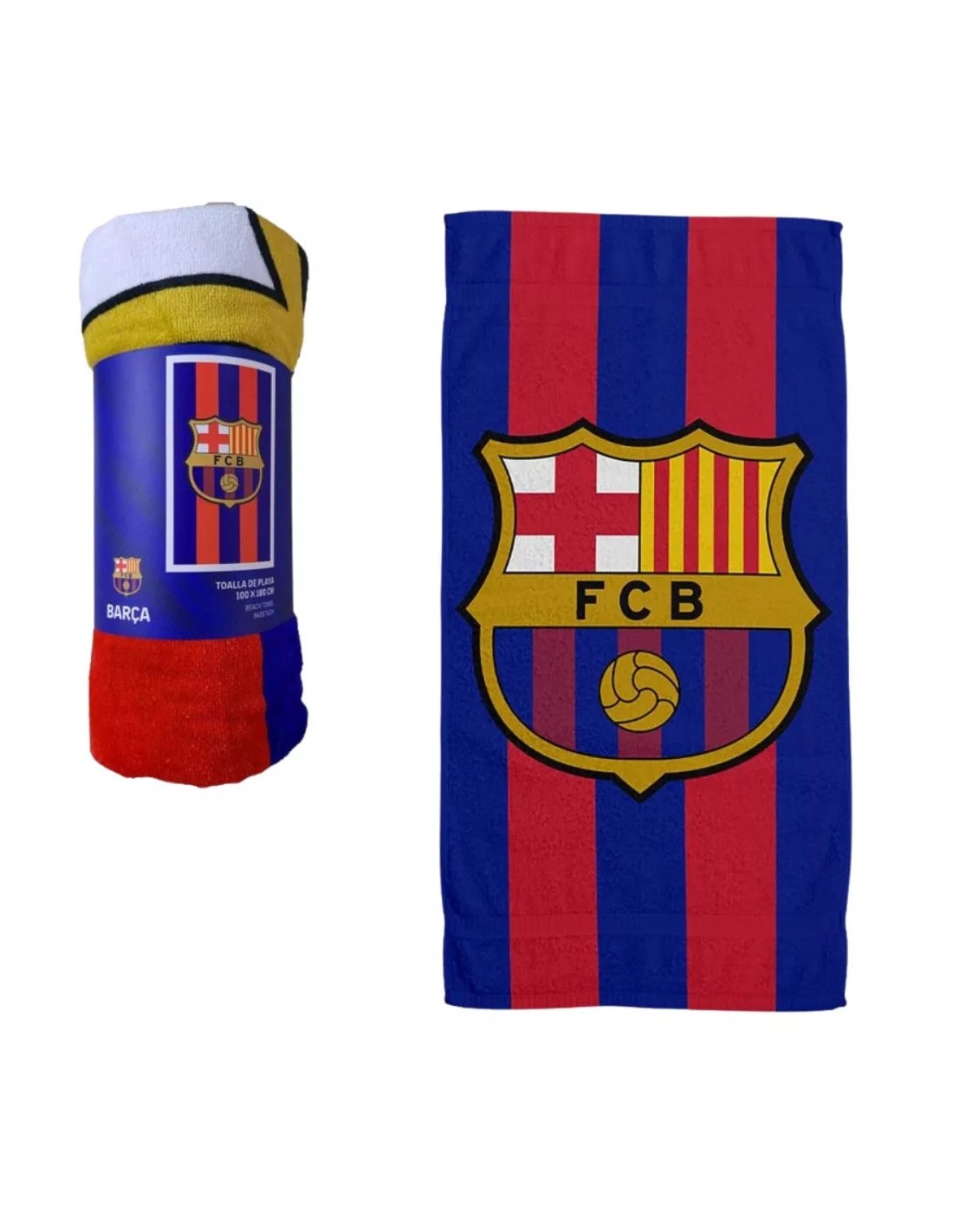 la serviette arbore les couleurs emblématiques du club, le bleu et le grena, et est ornée du blason du FC Barcelone, ce qui la rend reconnaissable et attrayante pour tout fan.