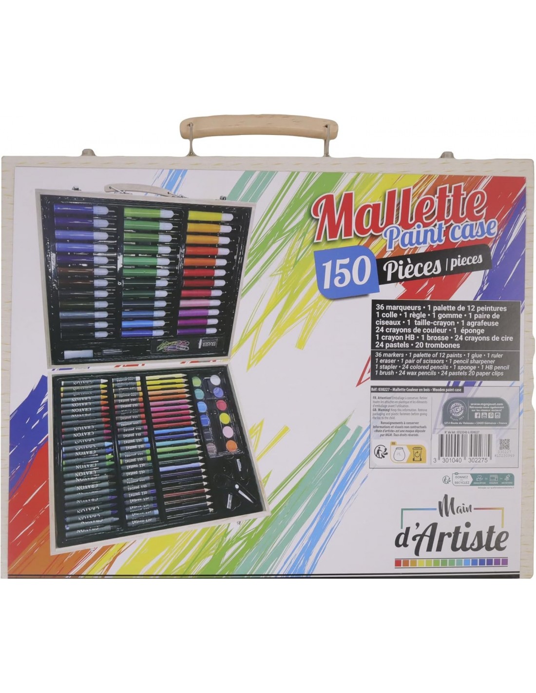 - CONTENU : Ce pack contient 36 marqueurs, 12 peintures, 1 colle, 1 règle, 1 gomme, 1 palette, 1 ciseau, 1 taille-crayon, 1 agrafeuse, 24 crayons de couleur, 1 éponge, 1 crayon HB, 1 brosse, 24 crayons de cire, 24 pastels, 20 trombones , le tout rangé dans une mallette pratique en bois